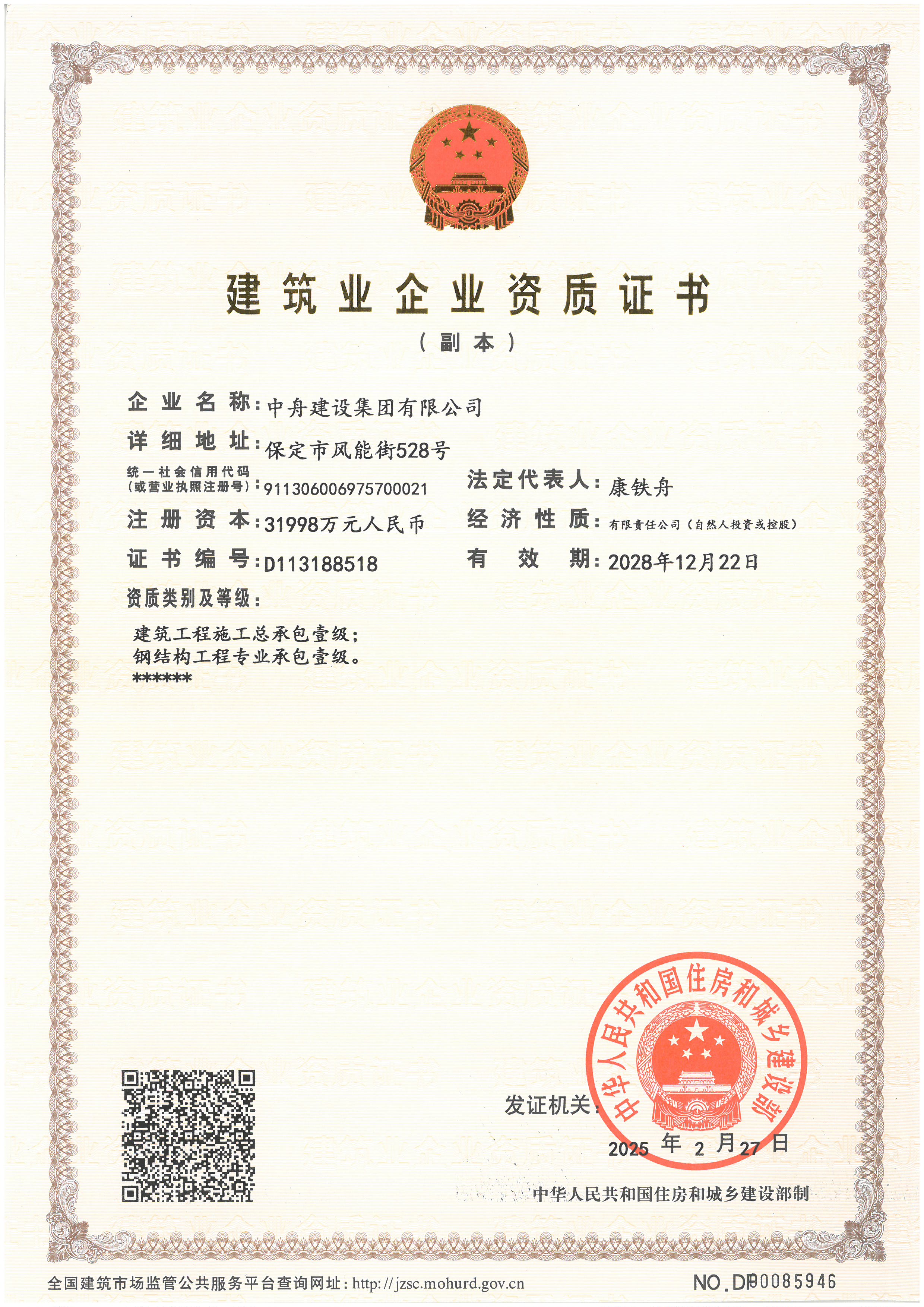2023年7月      获批“钢结构工程专业承包壹级”